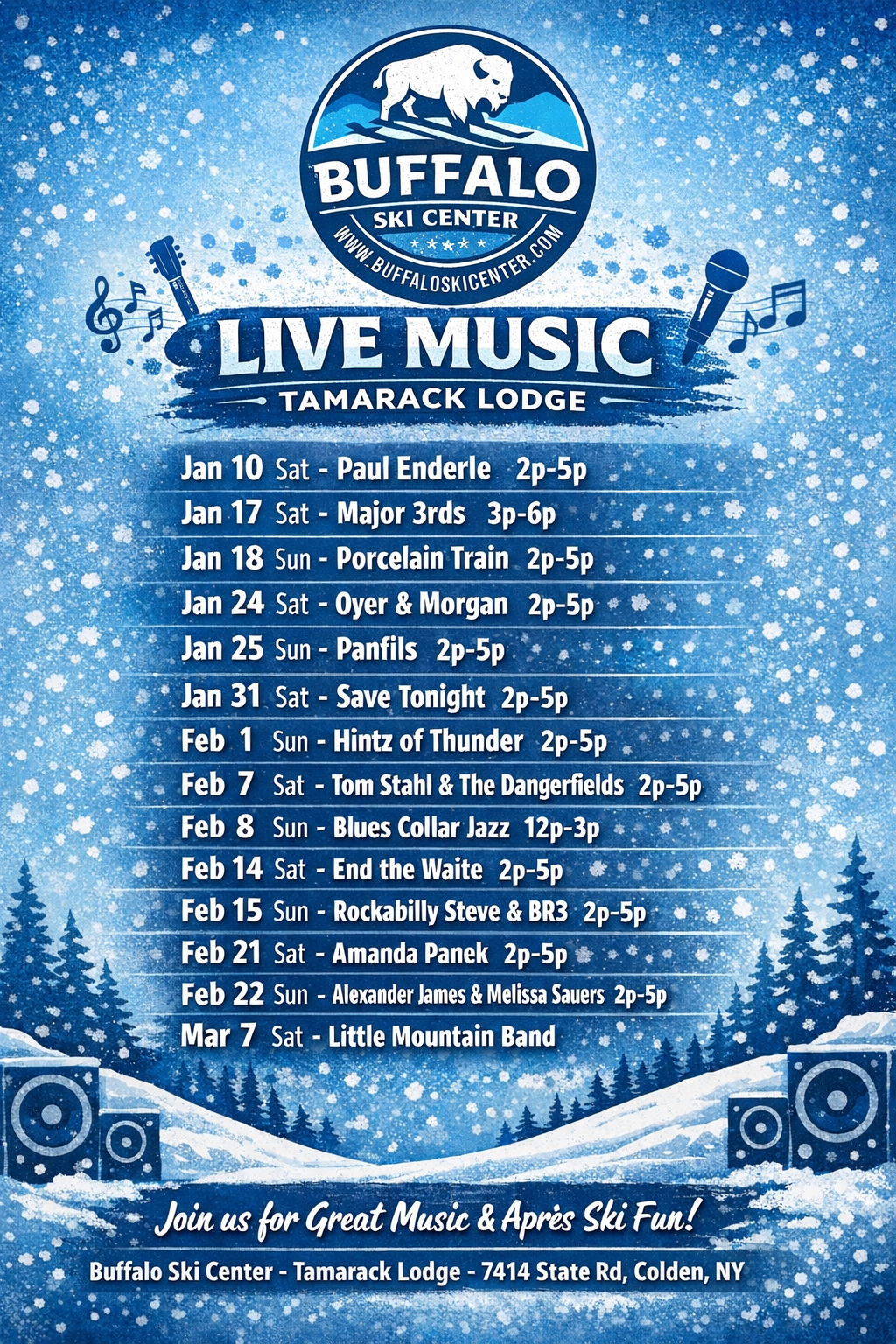 LAKE EFFECT SNOWIt doesn’t always happen but when it does, it’s magic. Snow Report SKI MORE, DRIVE LESS.Ski after work or play hooky. You deserve it. Get Your Pass 2026 TRIAL MEMBERSHIP FIND OUT MORE Live Music 2026 Trial MembershipTry on the Buffalo Ski Center next winter. Your family will thank you. $999 LEARN MORE Snowsports SchoolWe have a great selection of lessons for skiers or boarders. Members only MORE INFO Hours and Rates Trail Conditions